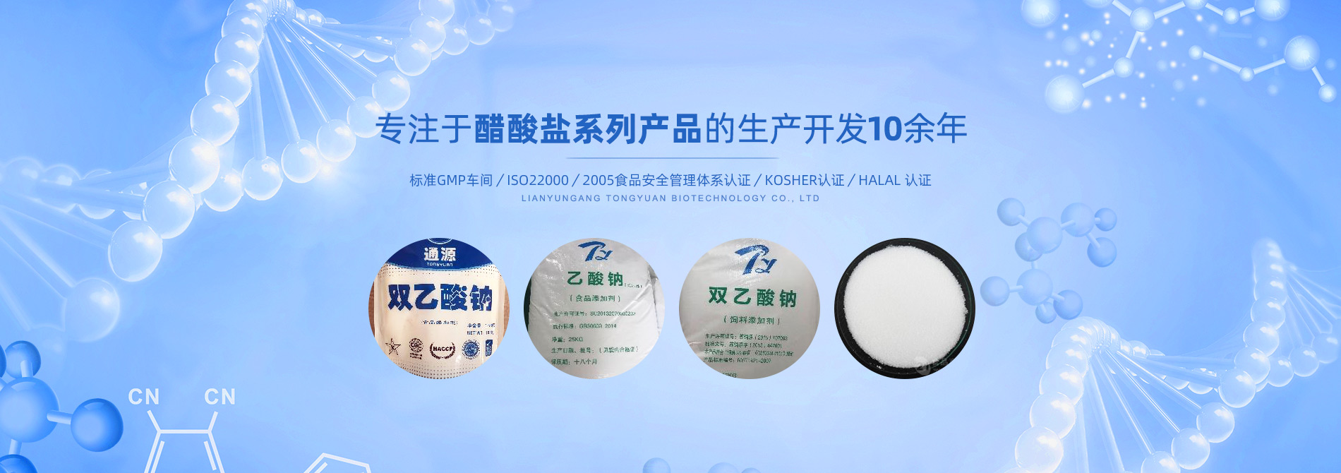 連云港市通源生物科技有限公司 是生產雙乙酸鈉、無水醋酸鈉、三水醋酸鈉、醋酸鉀、乙酸鈉、丙酸鈉、丙酸鈣和氯化鉀等系類醋酸鹽產品的專業制造商。公司專注于醋酸鹽系列產品的生產開發10余年,是國內專業醋酸酸鹽產品生產基地。 目前,我們已和全球30多個國家和地區建立長期的業務合作關系,是中國較大的雙乙酸鈉生產商和出口商之一。作為中國食品添加劑和配料協會理事單位,通源公司已建成標準GMP車間5000余平方米,通過了ISO22000:2005食品安全管理體系認證、KOSHER認證、HALAL 認證等,這些都是我們提供高質量產品和優良服務的前提和確保?! ∩a出色產品,提供優良服務,滿足顧客需要,是我們努力的目標。愿和我們的朋友們攜手,共...